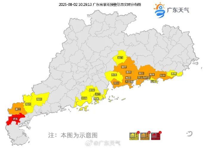8月2日,随着低涡逐渐移近影响,广东省中南部市县有中到强雷雨局部大暴雨,其余市县多云有(雷)阵雨局地暴雨。
