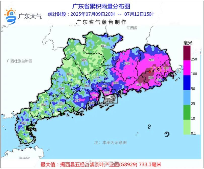 “丹娜丝”虽不直接登陆广东,但它登陆后残涡与西南季风“联手”,9日夜间—12日白天给粤东、河源、梅州和珠三角中南部市县带来了暴雨到大暴雨局地特大暴雨,此次降水具有“强降水落区集中、暴雨持续时间长、单点累积雨量大”的特点,揭阳揭西县五经富镇录得全省最大累积雨量733.1毫米。