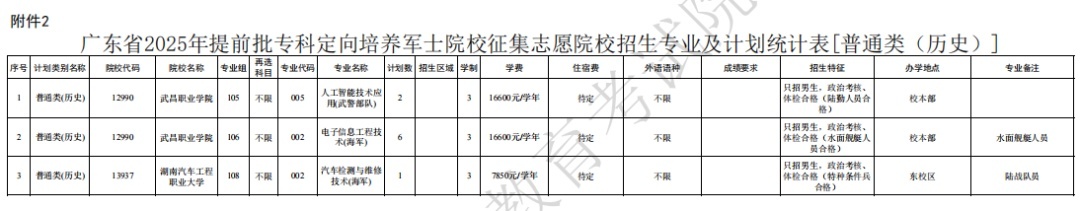 2.广东省2025年提前批专科定向培养军士院校征集志愿院校招生专业及计划统计表[普通类(历史)]