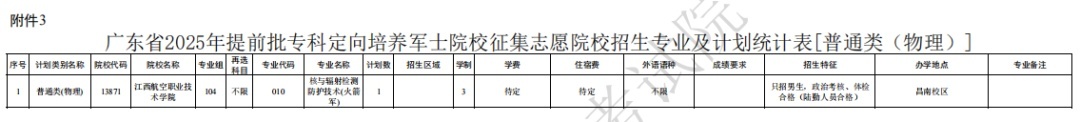 3.广东省2025年提前批专科定向培养军士院校征集志愿院校招生专业及计划统计表[普通类(物理)]