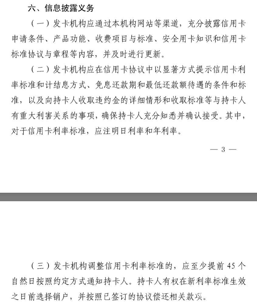 “发卡机构应在信用卡协议中以显著方式提示信用卡利率标准和计结息方式、免息还款期和最低还款额待遇的条件和标准,以及向持卡人收取违约金的详细情形和收取标准等与持卡人有重大利害关系的事项,确保持卡人充分知悉并确认接受。其中,对于信用卡利率标准,应注明日利率和年利率。”
