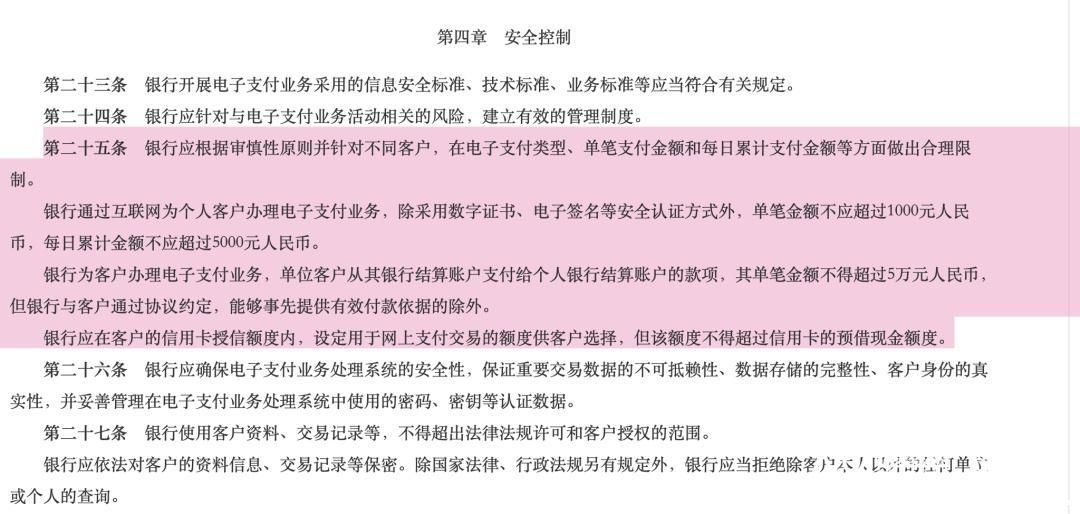“银行通过互联网为个人客户办理电子支付业务,除采用数字证书、电子签名等安全认证方式外,单笔金额不应超过1000元人民币,每日累计金额不应超过5000元人民币。”