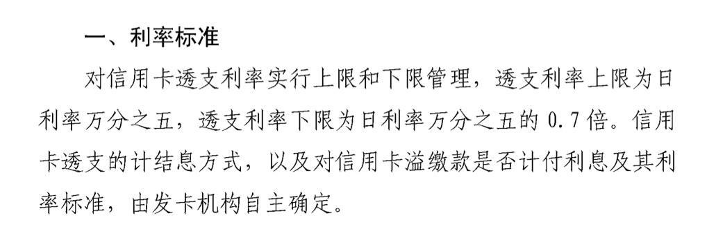 具体来看,删除第一条中“对信用卡透支利率实行上限和下限管理,透支利率上限为日利率万分之五,透支利率下限为日利率万分之五的 0.7 倍”的表述。