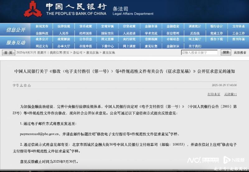 8月29日,中国人民银行官网发布关于《修改〈电子支付指引(第一号)〉等4件规范性文件有关公告(征求意见稿)》公开征求意见的通知(下称“通知”)。