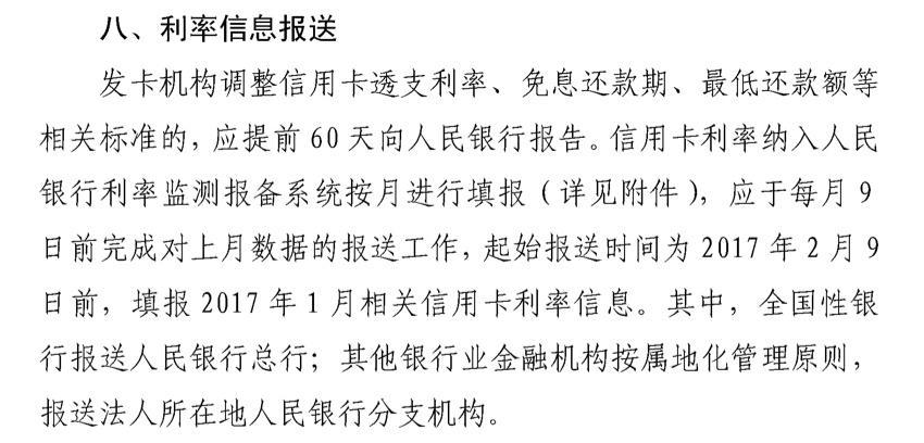 最后是删除第八条中“发卡机构调整信用卡透支利率、免息还款期、最低还款额等相关标准的,应提前 60 天向人民银行报告”、“起始报送时间为 2017 年 2 月 9 日前,填报 2017 年 1 月相关信用卡利率信息”的表述。