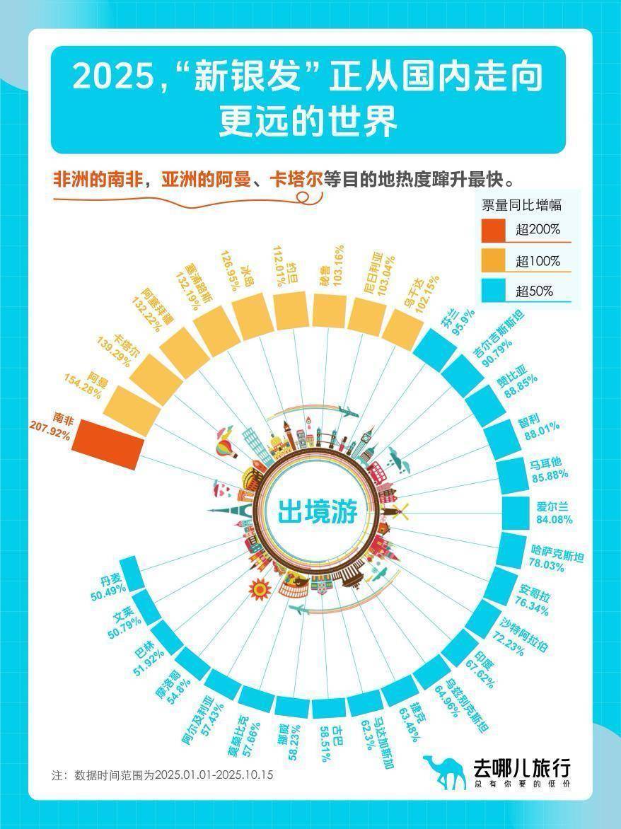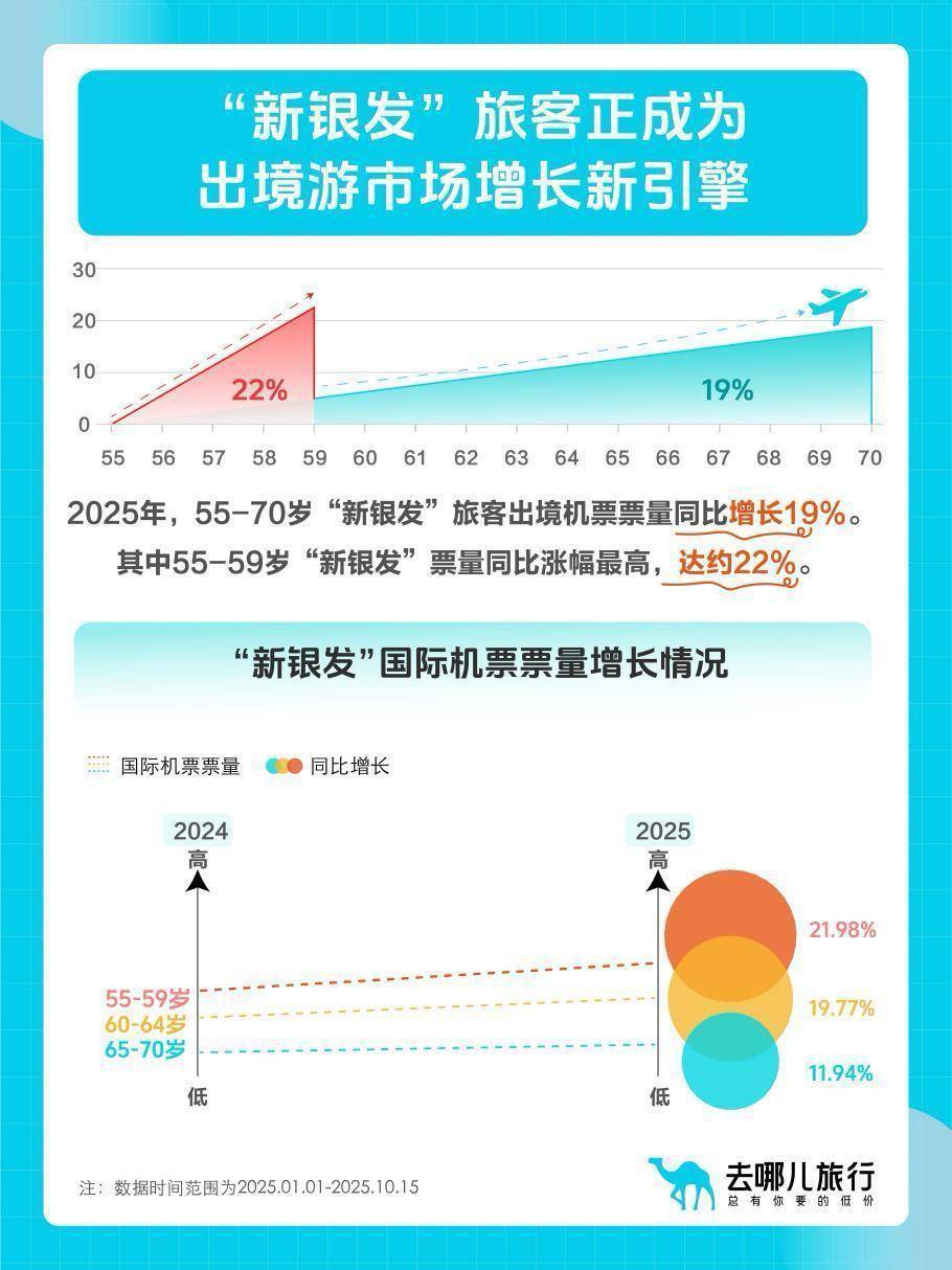 据去哪儿旅行数据,2025年,平台55岁至70岁年龄的出境机票票量,同比增长19%。同时,他们在去哪儿平台上购买出境游“人生第一张机票”的票量同比增幅达到21%,高出整体平均值。